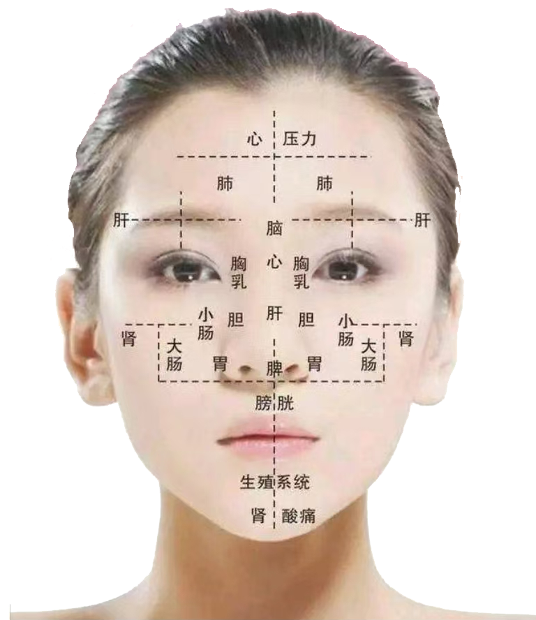 反射区域在颧骨下方偏内侧部位。若此部位有红血丝、青春痘、斑、