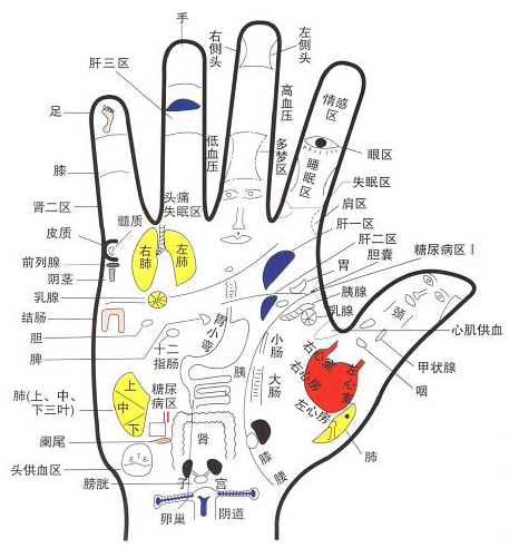 ②手掌热:多见失眠多梦,心烦,口干口苦,咽炎、糖尿病、便秘等。